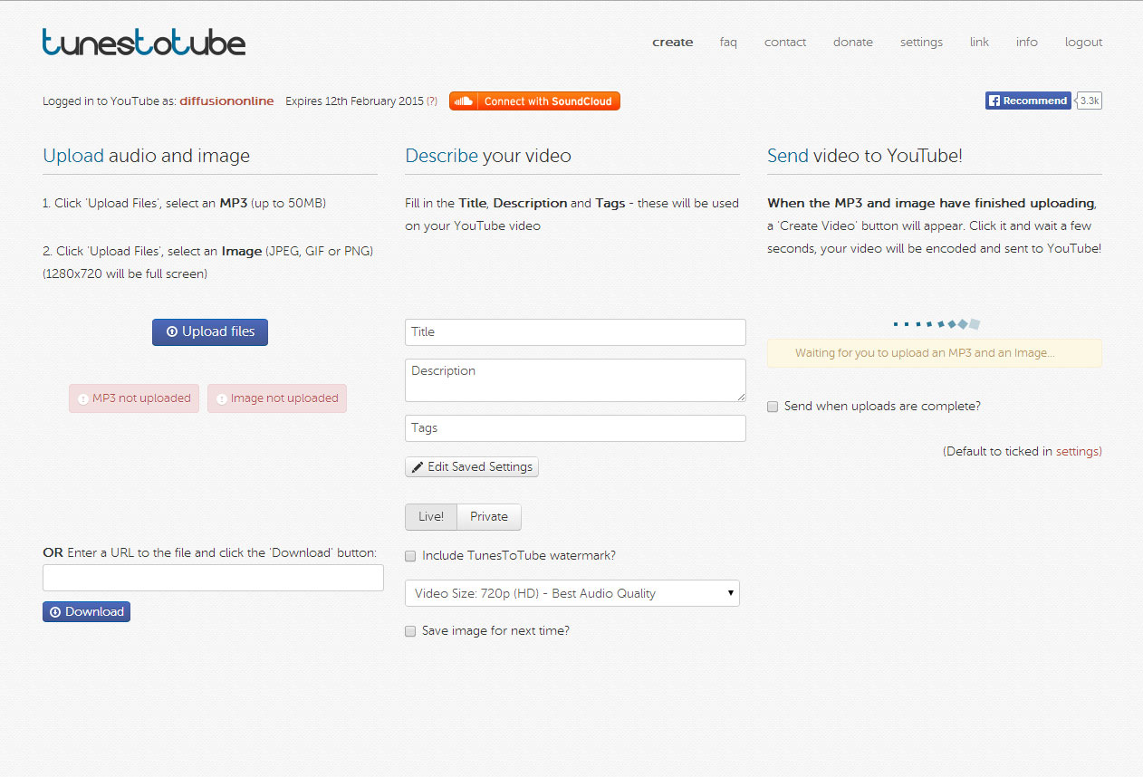 Here’s how it works. Connect tunestotube to your YouTube channel, upload an mp3 and a jpg from your hard drive and tunestotube will almost instantly (and I mean instantly) create a 720p video on your channel. It’s that simple. The service is free but if you donate to them you remove watermark which is even better. Try it out. Here’s one I prepared earlier.