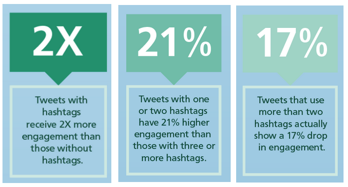 - Tweets with hashtags are likely to get twice as much engagement than without