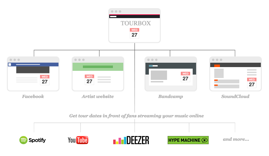 Wouldn’t it be great if someone played one of your tracks on Soundcloud, YouTube or Spotify and they could see where your future gigs were? Well that’s what Songkick Tourbox allows you to do.