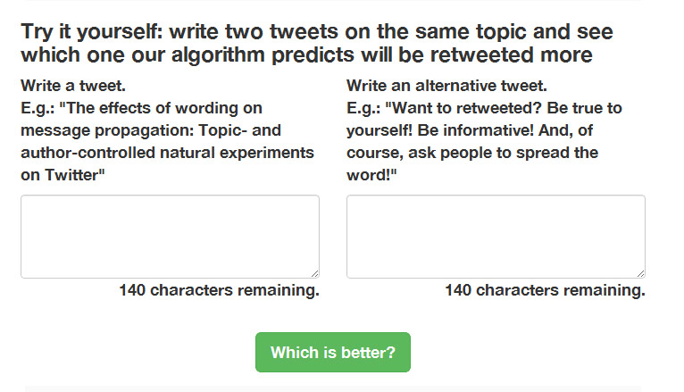 ‘Retweeted More’ uses an algorithm to compare two tweets on the same topic and it tells you which one is likely to be retweeted more! It’s as simple as that!