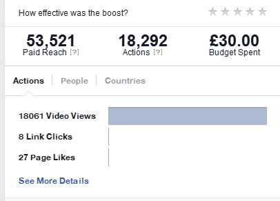 Having uploaded the video for the single to Facebook I spent £30 to promote it. I’m sure at the time it was only suggesting that would get me an additional reach of 13,000. Here’s what I actually got in total: a reach of 63,500 (double our Facebook audience) and 22,500 views of the video.
